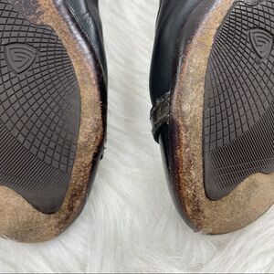 Attilio Giusti Leombruni (AGL) buckle ballet flats size 37. Black leather with blank patent leather round toe. Buckle hardware across vamp. Small heel and elasticized top. Slip on style with leather sole. Minimal marks on shoes with wear on soles. This refined flat features the iconic AGL silhouette handcrafted of glove-like leather with an elasticized topline for an easy fit and rubber sole insert for comfort and durability.