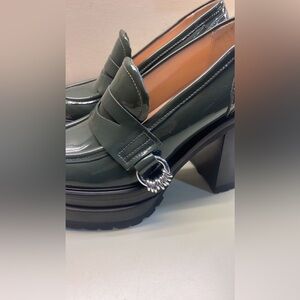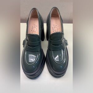 Stylish green patent leather loafers by AGL. Features a sleek design with a chunky sole.