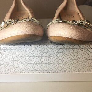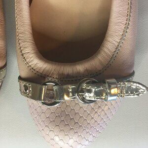 A chic textured snake-skin inspired contrasting cap toe accented with a buckle strap across vamp refreshes the look of a staple ballet flat designed with an elasticized topline for a stay-put fit. Cushioned footbed, Leather upper and lining/leather and rubber sole, Made in Italy. Soft pink color