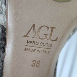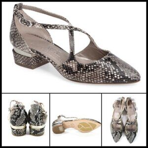 AGL Split Heel d'Orsay Pump Fog Snakeprint Pump in European Size 36. A pointy-toe pump with crossover straps gives any ensemble an incredibly polished finish and looks chic and contemporary with a split block heel 1 1/4". Adjustable strap with buckle closure. Leather upper. Leather & synthetic sole. Made in Italy.