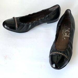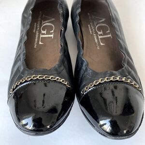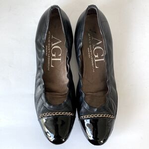 AGL Sport Black Leather & Patent Ballet Flats Gold Chain Accent US 9.5 Feminine