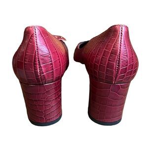 Croc embossed leather adds a luxurious finish to this pointed toe pump set on a sophisticated