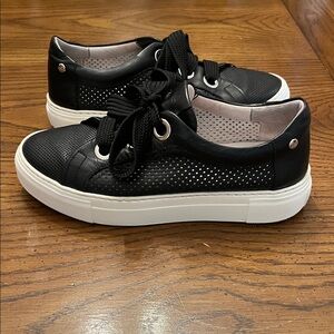 Elegant black sneakers with perforated design. Features bold black laces and contrasting white platform soles. In great condition.