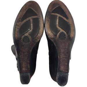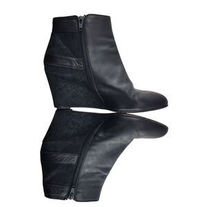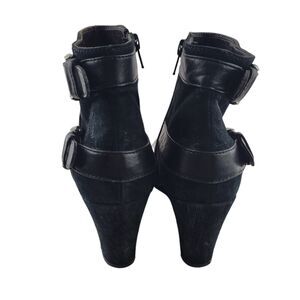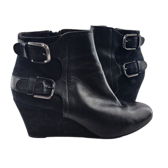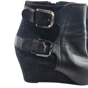 AGL Wedge Heel Ankle Booties Womens 37.5 7.5 Black Leather Rocker Glam Buckles