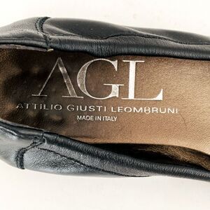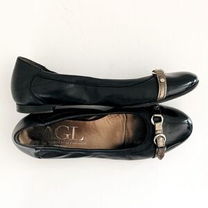 These AGL flats in classic black and Metallic Tan offer a sleek and sophisticated look, featuring a shiny patent finish and a stylish silver buckle embellishment. The rounded toe design ensures comfort, making them perfect for both casual and formal occasions. With a durable sole and a luxurious interior lining, these shoes are a timeless addition to any wardrobe.