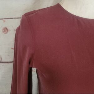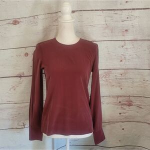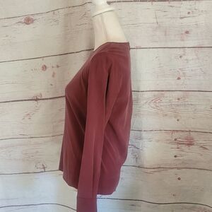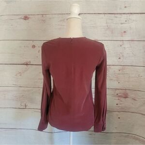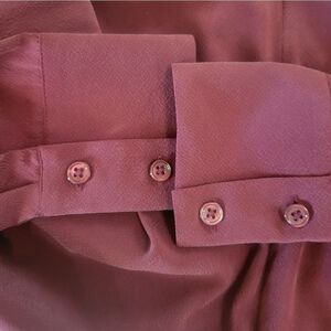 Wine colored long sleeve silk blend blouse with button cuffs.