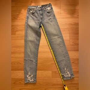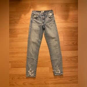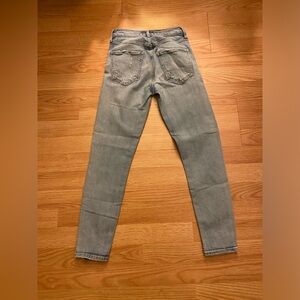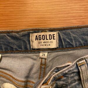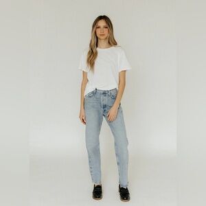 The AGOLDE 90's Jean in Snapshot. Crafted with Organic Cotton, this mid-rise jean offers a relaxed fit through the hips and a loose, straight leg for effortless style. With a clean, vintage indigo wash and a subtle distressed hem, this timeless piece will only get softer with each wash.
