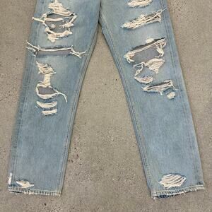 Featuring heavy distressing, these loose fit jeans are new with the tags still attached.
