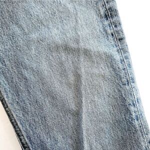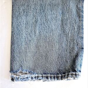 these are in good pre-owned condition. the factory distressing on the heel has become more distressed with part of the hem loose. There is a discoloration on the thigh. I have included a close up picture but it's hard to see.