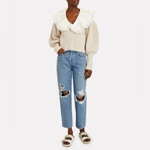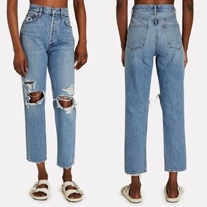 Cropped in their Wander light wash denim, AGOLDE's Fen jeans are distressed along a straight-leg silhouette for versatile styling. Belt loops. Zip fly and button closure. Five pocket styling.