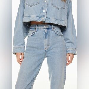 These are high-rise jeans with a slim leg designed to elongate your frame. They're crafted with low-stretch organic cotton denim. This version comes in a light vintage indigo wash with a finished hem.