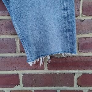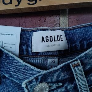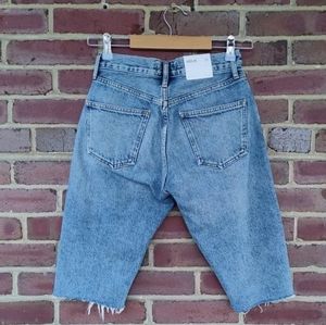 Agolde Carrie long length slim jean short. Featuring a raw hem, hidden button fly and 5 pockets. Size 23.