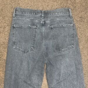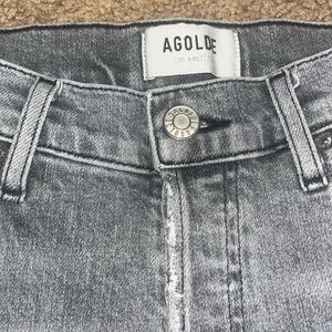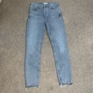 AGOLDE Nico High Rise Slim Jeans Risk Grey Stone Wash 26. Style Number: A093-1138. AGOLDE's Nico high-rise skinny jeans are updated in faded grey denim and styled with raw cut-off hems. Belt loops. Button fly and closure. Five pocket styling. Ankle crop. In grey wash denim. High-rise. Skinny silhouette. Low stretch denim. 98% cotton, 2% elastane. Approx measurements: 11“ rise, 27“ inseam, & 12.5“ waist. Great pre-owned condition. No stains/flaws. Smoke/pet free home. Offers welcome. Bundle & save. Ship same/next day. Packaged w/ care.