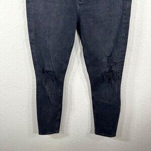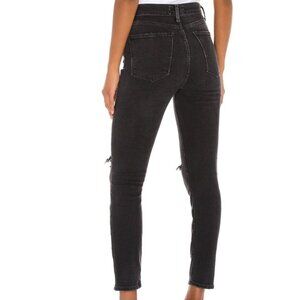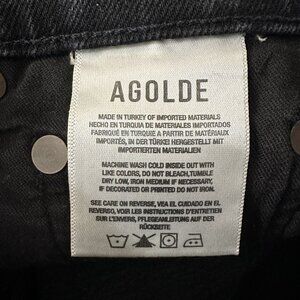 AGOLDE Nico High Rise Slim Jeans in Cassette. 98% cotton, 2% elastane. Light fading and destroyed detail. Button fly. 5-pocket design. Black slim leg distressed jeans. *AI cover photo depicting style of jeans.