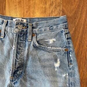 AGOLDE Parker Vintage Cut Off Shorts in Swapmeet, Size 23, Medium Blue Wash, Distressed Detail, High Rise, High Waist, High Waisted, Button Fly, 100% Cotton, Nonstretch Denim, In like new condition with no flaws or signs of wear.