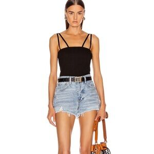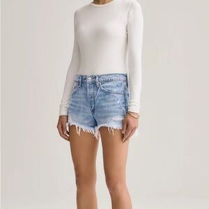 Stylish Agolde jean shorts. Light blue denim. Frayed hem. Perfect for casual wear. everyday vacation travel cotton cruise date dinner brunch dress up glam Preppy academia smart preppy expensive cotton