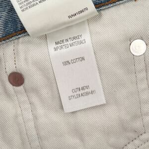 Details: Distressed finish, raw frayed hem, five-pocket design, zip fly with button closure