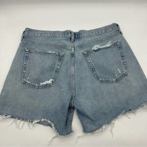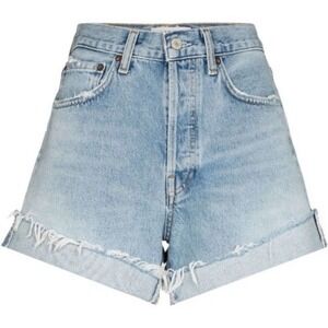 Parker long denim shorts from AGOLDE featuring light blue, cotton, distressed finish, belt loops, button fly fastening, classic five pockets and turn-up hem.