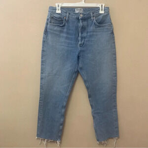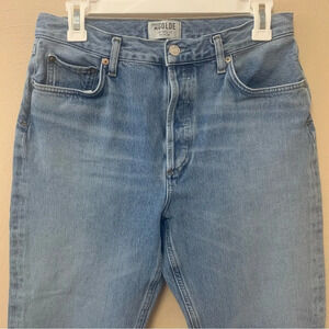 The label's Remy high-rise jeans showcase a slim, straight leg silhouette. They're made from organic light blue denim infused with a hint of stretch.