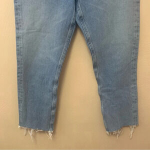 Belt loops. Hidden button fly. Five pocket styling. Copper-tone hardware. Light blue denim. Raw hem.