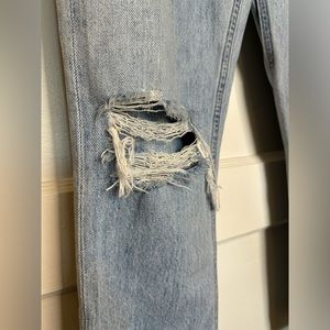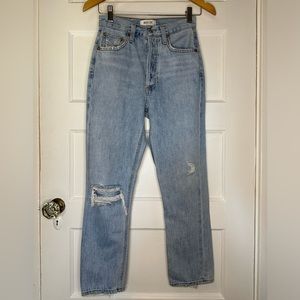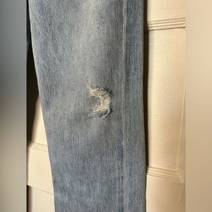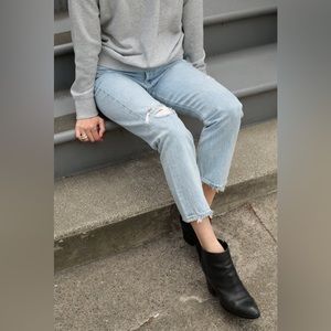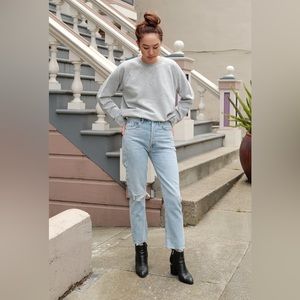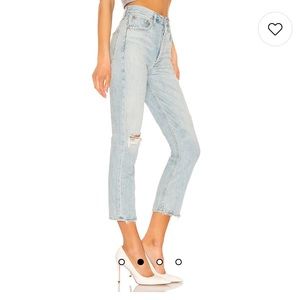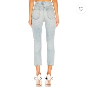 Hi rise slim straight, sits close to the body with a cropped inseam. A light blue vintage wash with slight distressing and frayed hem. 5 pocket styling, button fly, and copper rivets.