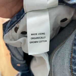 Subtle stretch denim fabric with light fading and distressing at seams