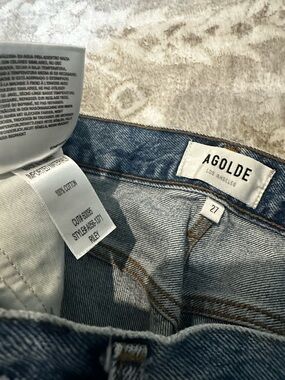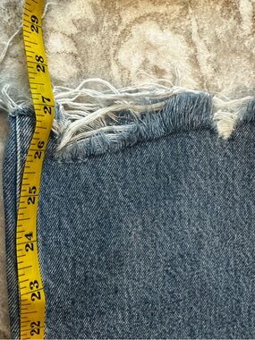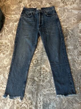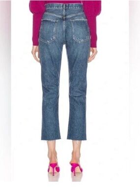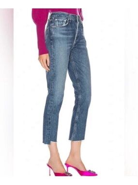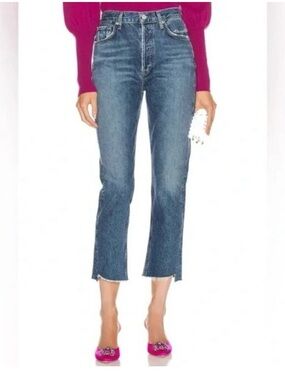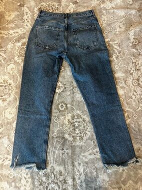 Effortless mid-rise cropped straight jeans. Classic blue denim with subtle wash and whiskering. Clean five-pocket styling and zip fly. Slight raw hem for modern edge. Easy to dress up or down.