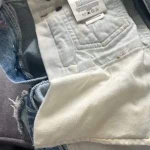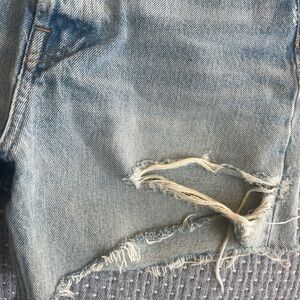 AGOLDE distressed denim shorts in size 23. 10.5” rise, 4”inseam, button fly, raw hem with rips. Very slight discoloration on inside pockets (cannot see when wearing)