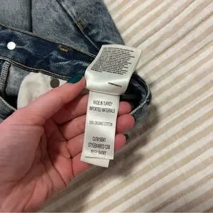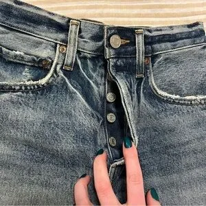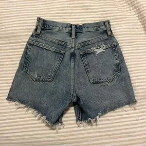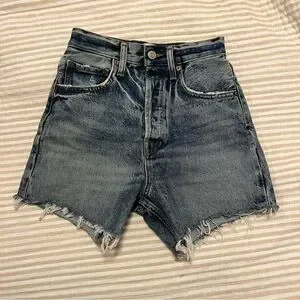 Chic light blue jean shorts by Agolde. Features a frayed hem and classic five-pocket design. Perfect for everyday wear.