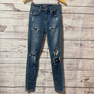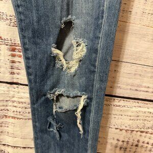 Features classic 5 pocket styling, high waist and intentional ripping and distressing.