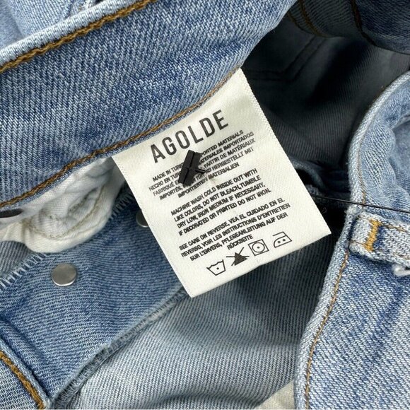 AGOLDE women's size 32 jeans, they are the Nico style, color is Blame, 5-pocket design, belt loops, hi-rise, whiskering, thick fabric, slim leg, light distressing on pockets/hem, stretchy denim, with button-fly closure. Materials 59% organic cotton, 40% rayon, 1% elastane. Care machine wash cold, lay flat to prevent fabric fade, can tumble dry low. Condition is preloved very good as shown in pictures. Please preview measurements to ensure fit.