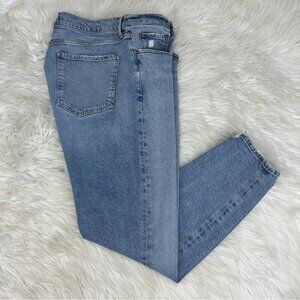AGOLDE women's size 32 jeans, they are NICO style, color is blue Cycle, 5-pocket design, belt loops, hi-rise, whiskering, medium weight fabric, skinny slim leg fit, ankle cut, light distressing on pockets/hem, stretchy denim with button-fly closure. Materials 66% lyocell, 32% organic cotton, 2% elastane. Care machine wash cold, lay flat to prevent fabric fade, can tumble dry low. Condition is preloved good with distressing at pocket and frayed hem as shown in pictures. Please preview the measurements to ensure fit.