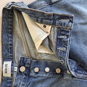 Trending luxury brand Agolde women's 100% cotton medium wash cut-off denim jean high-rise long shorts with raw hems and button fly front. Pre-owned and in very gently used condition. Please see pictures.