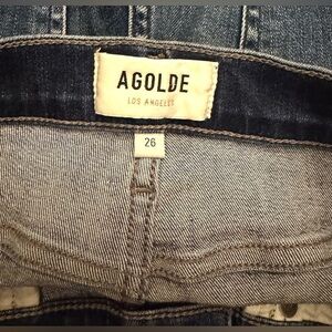 Stylish Skinny leg jeans by Agolde. Rich blue hue. Frayed hem for a modern touch.