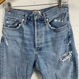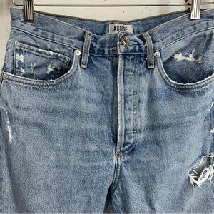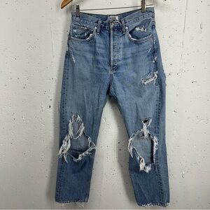 AGOLDE Women's size 26 Loose Fit 90's Mid Rise Distressed Destroyed Jeans. There maybe some extra distressing of holes ( side hip hole) besides that n good preowned condition.