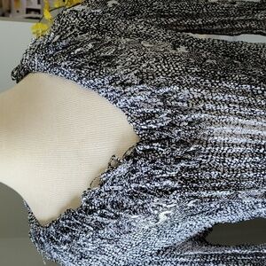 This blouse is so lovely scoop neck, stretch to crinkle fabric. Sleeves and neck line have fringe. Great look for club or dinner Date. Size large. pit to pit flat measurement is 22". sleeves are about 14". Top to bottom length is 24".