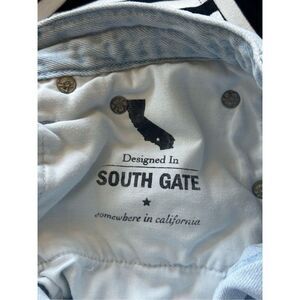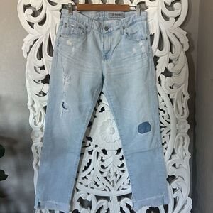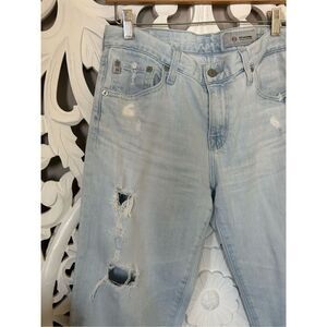 AG-ED Denim in Slim Ex-Boyfriend slouchy slim cut. Patch details and purposely placed distressing. Color is faded light blue. Step-up ankle cutoff hem. Back patch at belt line is a bit shrunken but does not effect the fit. See all images.