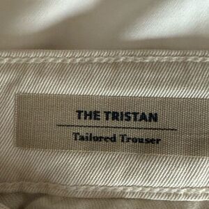 AG The Tristan tailored trouser beige straight leg woman’s pant. Features zipper &button closure,side pockets,faux button back pockets,slightly relaxed fit. Can be worn with cuffs rolled up.