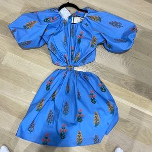 Worn once and in great condition. Charming blue mini dress with vibrant floral patterns. Features puff sleeves and a gathered waist.
