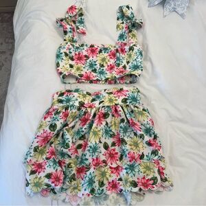Chic floral print set with vibrant pink and green hues. Ideal for sunny days.