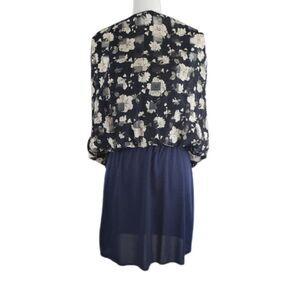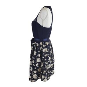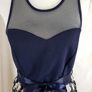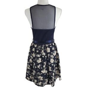 Chic navy fit-and-flare dress featuring a sheer mesh neckline and back for a modern, feminine touch. The lightweight woven floral skirt is fully lined with soft drape and gentle gathering at the elastic waist. Finished with a removable satin tie belt and belt loops for easy styling. A couple of small catches in the mesh (front & back) but no holes—see photos.