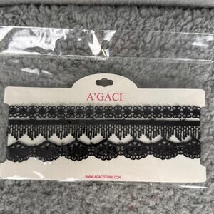 Set of 3 A'Gaci chokers in black. Includes beaded, lace-patterned, and solid styles. Adjustable closures. Perfect for goth, whimsygoth, or Y2K looks.