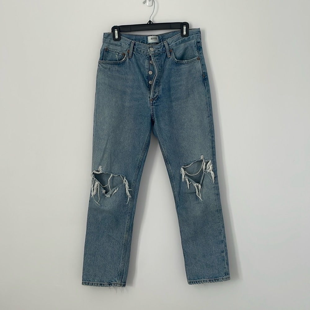 Riley Ripped High Waist Straight Leg Organic Cotton Jeans. ESCALATE MEDIUM WASHED. Size 28. Like New. Style number A056E-1206.