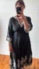 Details: Black Boho/bohemian natural silk kaftan with white embroidery around the neckline, cuffs, and hem, 3/4 sleeves, open v-neck, with a elastic gathering under the bust. Feminine and romantic.