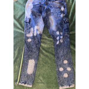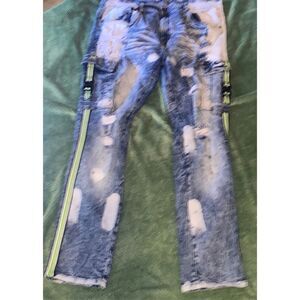 Great pair of stretchy jeans distressed with green striped buckles on the side Paint splatter distressed awesome looking pair jeans