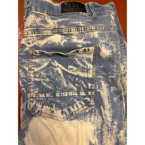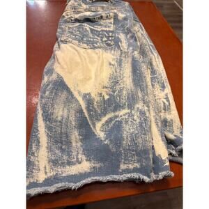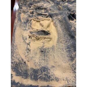 Another Hype Piece (AHP) Men's Urban Streetwear-Inspired Jean Shorts. These light blue distressed denim shorts are a size 50 waist. They feature a faded acid-washed effect with white splotches and distressed detailing, including rips and frayed edges. The brand AHP is visible on the front. These casual knee-length shorts are perfect for warmer weather. They are in excellent condition with no notable signs of wear. Grab these stylish and unique jean shorts today!