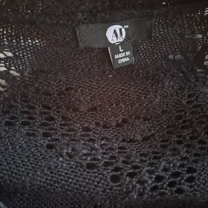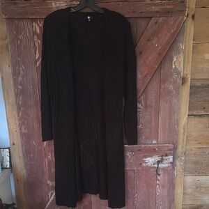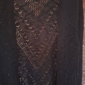 A&I black lacey knit long open front duster/cardigan. Large. Armpit to armpit across back approximately 22 1/2 inches. Shoulder to hem approximately 41 inches. Soft 100% acrylic. Nonsmoking home.