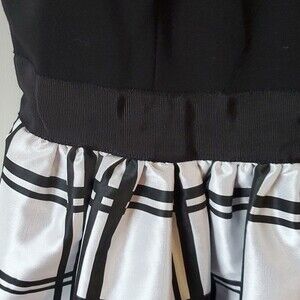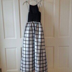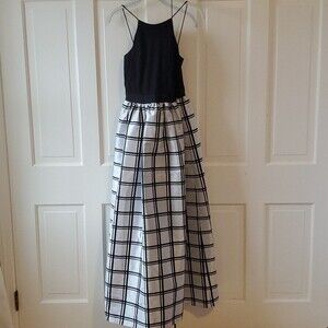 Striking long formal dress with black halter top and black and white windowpane long gathered skirt. Top is stretch knit; bottom has a taffeta-like feel. Pre-owned in excellent condition.