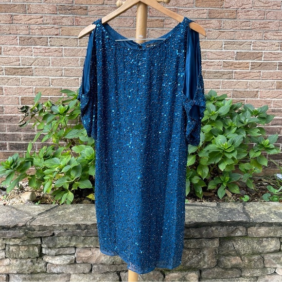 AIDAN MATTOX BEADED SEQUIN BEADED SILK Drape Cold Shoulder Party Dress Size 8