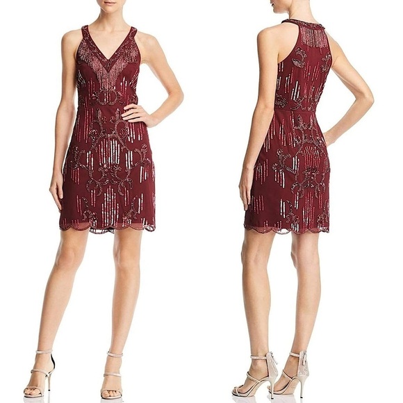 Intricately embellished on a mesh tulle overlay, this sleeveless piece flatters with a deep v-neckline trimmed with beaded fringes. The back is rendered with a racer design. The sheath skirt glides from the waist down to a scalloped hemline.
